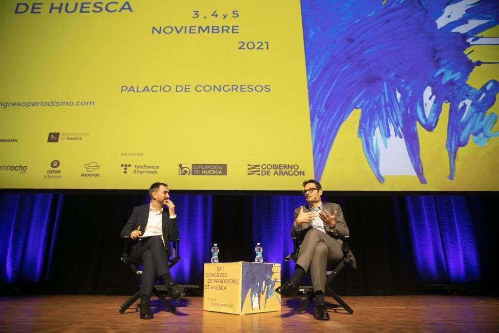 El XXII Congreso de Periodismo de Huesca ha abordado en esta segunda jornada las claves de la evolución periodística, como son la apuesta por los modelos de suscripción y la difusión de contenidos informativos y entretenimiento a través de canales como YouTube. La conversación del presidente del Grupo PRISA, Joseph Oughourlian, con el director de elDiario.es, Ignacio Escolar, ha sido el plato fuerte de la jornada vespertina en el auditorio del Palacio de Congresos de la capital oscense.