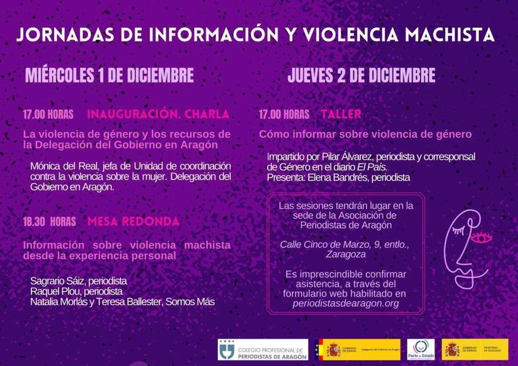 El tratamiento e información de la violencia machista es el eje principal de estas jornadas organizadas por el Colegio Profesional de Periodistas de Aragón y la Delegación del Gobierno en Aragón, el miércoles 1 y jueves 2 de diciembre, en la Sede de la Asociación de Periodistas de Aragón (Calle Cinco de Marzo, 9 Entlo., Zaragoza).