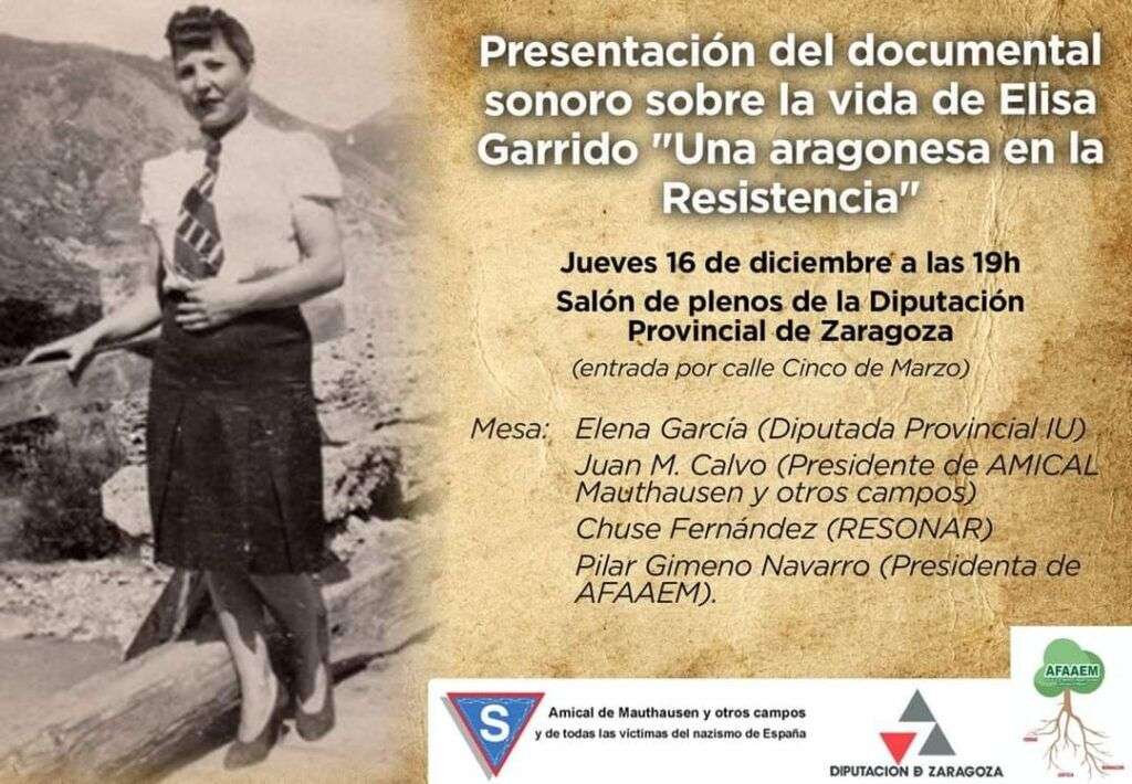 El documental sonoro “Una aragonesa en la Resistencia” será presentado el jueves, 16 de diciembre, a las 19.00 horas en el antiguo salón de plenos de la Diputación de Zaragoza, con acceso desde la calle Cinco de Marzo.