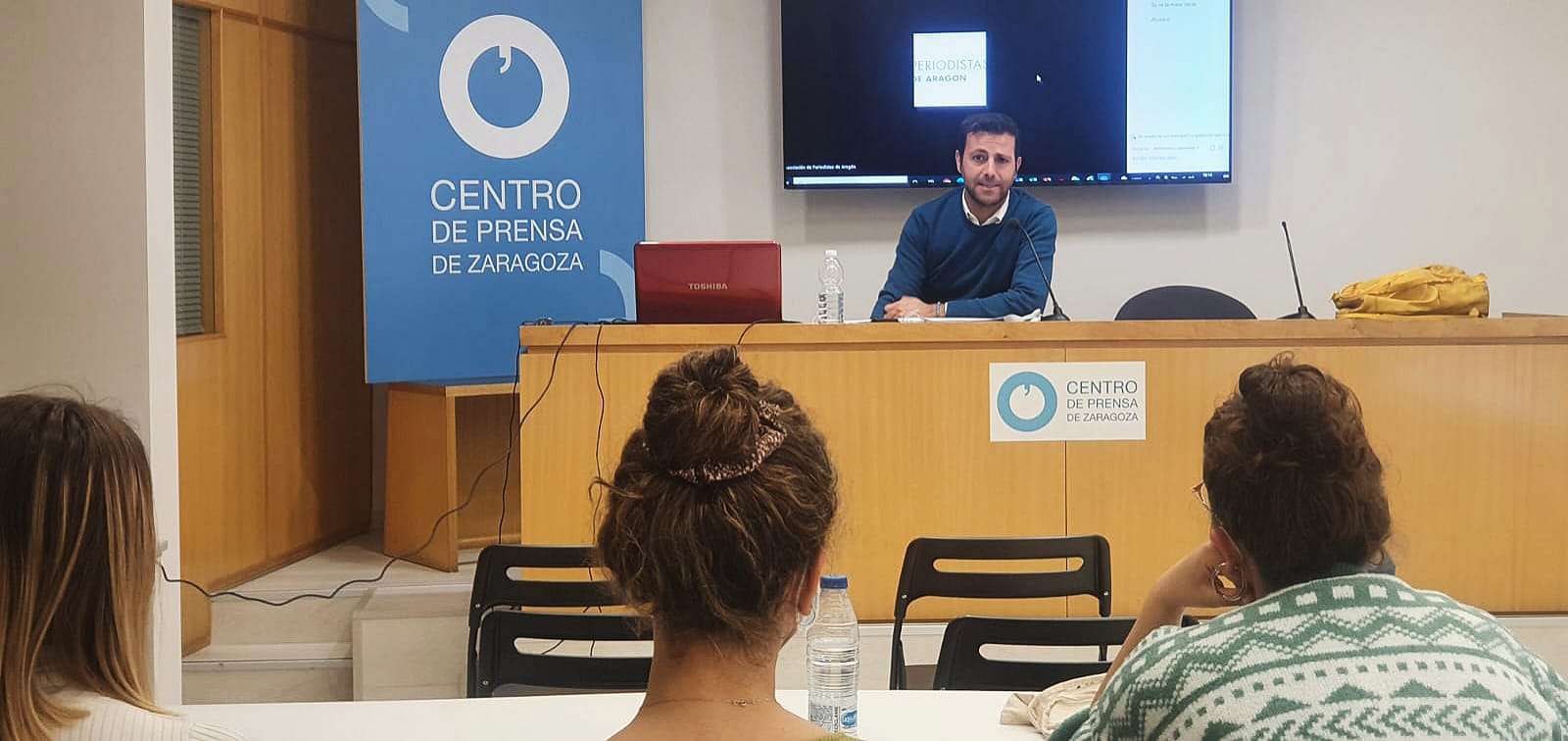 El periodista Alberto Gómez ha impartido este jueves, 10 de marzo, en la sede de Periodistas de Aragón el taller “Marca personal del periodista, ¿mérito propio o del medio?”, que se incluye en el programa de actividades de la nueva edición del Congreso de Periodismo de Huesca.