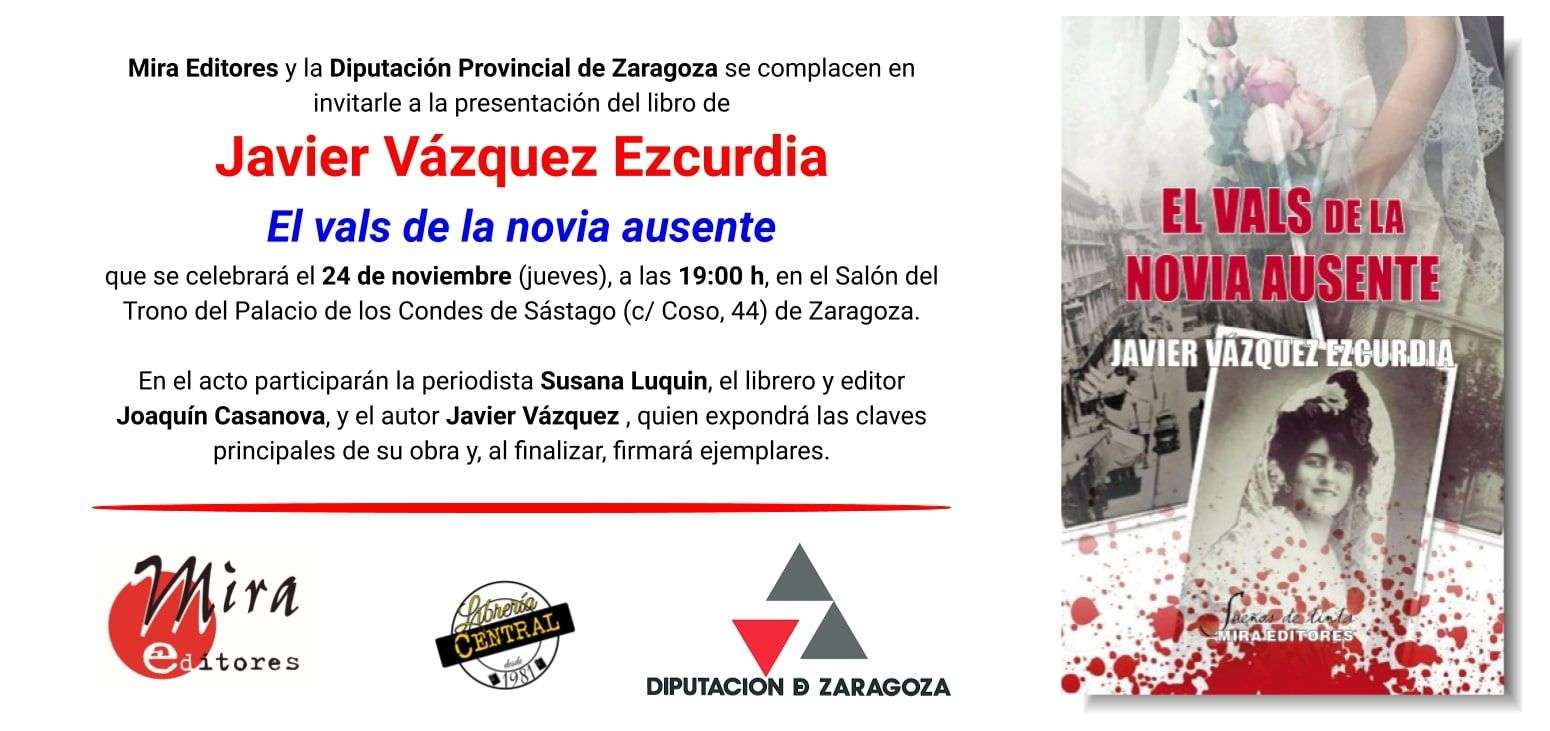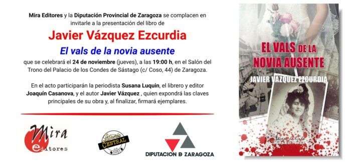 El escritor y periodista Javier Vázquez presentará su nueva novela, ‘El vals de la novia ausente’ (Mira Editores) donde prosigue la trama literaria de ‘Tango para una asesina’. En esta ocasión, Mercedes Ibor vuelve a acaparar en 1912 las portadas de los diarios, aunque esta vez por un motivo bien diferente al que, hace dos años, hizo que todos en la ciudad de Zaragoza la bautizaran como la cupletista detective.