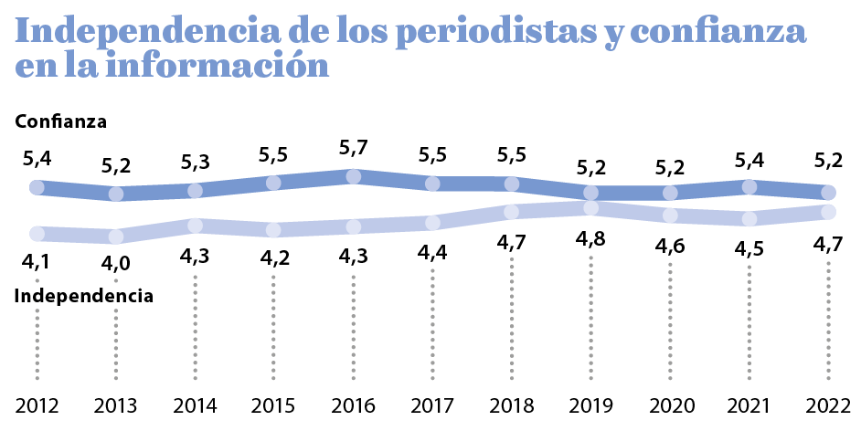 A pesar de estos problemas, la independencia de los periodistas ganó unas décimas, pero aún se sitúa por debajo del 5. Concretamente en un 4,7. Sin embargo, la sociedad española puntúa con un ligero aprobado, un 5,2, la confianza que le merece la información que recibe de los medios y que elaboran los periodistas.