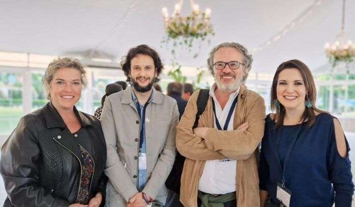 La presidenta y la vicepresidenta primera de la Asociación de Periodistas de Aragón, Isabel Poncela y Esther Aniento, junto al presidente de la Asociación de Periodistas de Talavera de la Reina, Iván López, y el presidente de la FAPE, Miguel Ángel Noceda, en la Asamblea de la Federación.