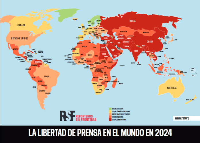 A escala mundial, se impone una constatación: la libertad de prensa está amenazada por los mismos que deberían ser sus garantes, las autoridades políticas. De los cinco indicadores que conforman la puntuación de los países, el indicador político es el que más desciende en 2024, con una caída de 7,6 puntos, según revela la nueva edición de la Clasificación Mundial de la Libertad de Prensa elaborada por Reporteros Sin Fronteras (RSF).
