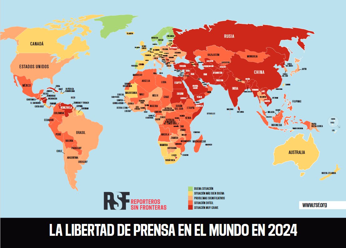 En la región de las Américas, la imposibilidad de los periodistas de cubrir historias relacionadas con el crimen organizado, la corrupción o el medio ambiente, por miedo a represalias, es un problema de primera magnitud. La proporción de países en situación “bastante buena” (amarillo) cae drásticamente, pasando de cerca del 36%, en 2023, al 21%, en 2024. Una de las mayores potencias económicas del mundo, Estados Unidos, pierde diez puestos. En casi todos los países de América del Sur, la situación de la libertad de prensa es ahora “problemática”. Este deterioro se explica esencialmente por la llegada al poder de depredadores de la libertad de prensa, como Javier Milei en Argentina, y por la incapacidad de los gobiernos para frenar la violencia contra los periodistas. México sigue siendo el país sin guerra más peligroso para los reporteros: 37 periodistas han sido asesinados desde 2019.