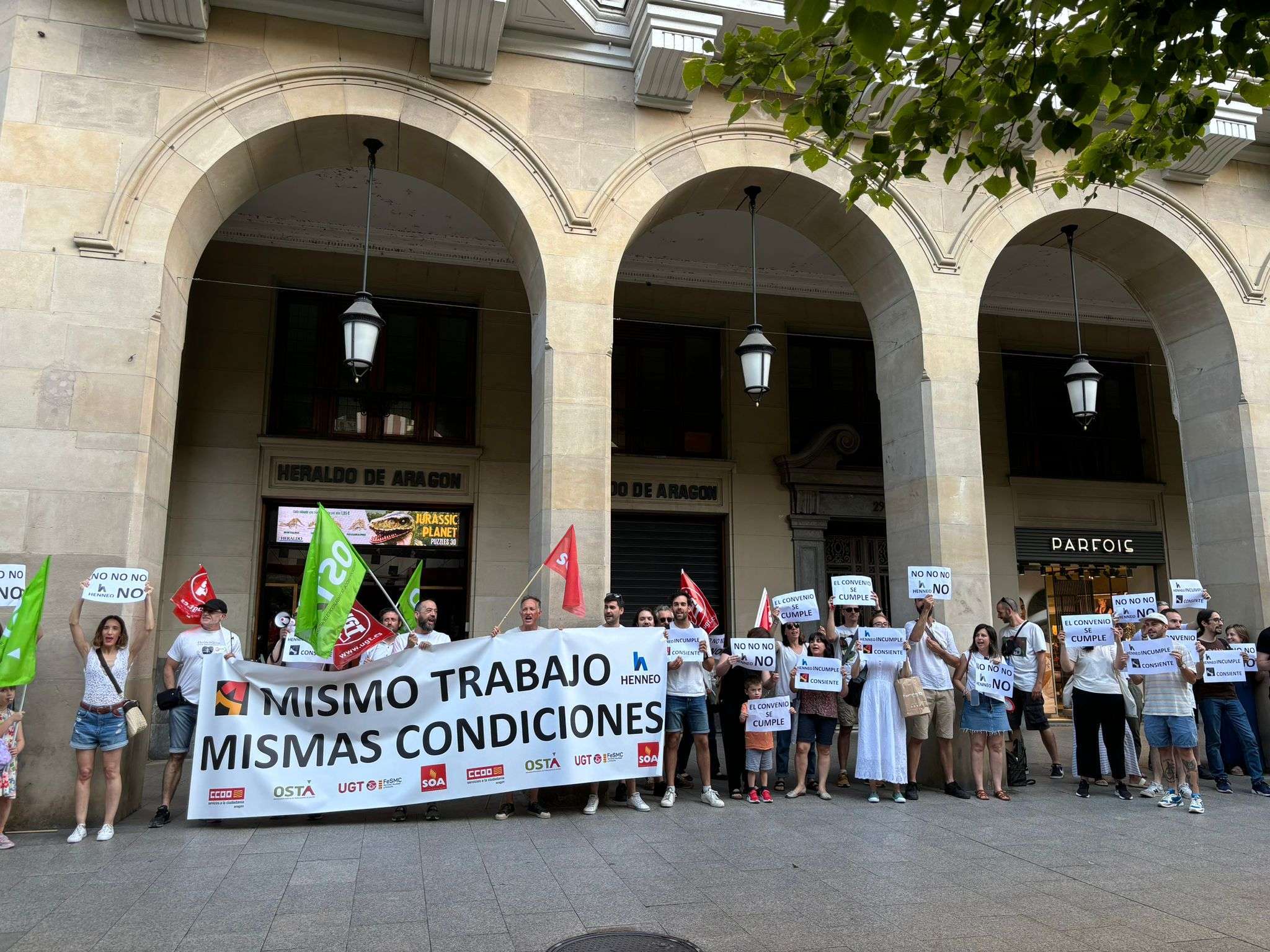 La plantilla de CHIP Audiovisual, la empresa del grupo Henneo que elabora los informativos de Aragón TV, se ha concentrado este martes, 25 de junio, frente a la sede del grupo Henneo en el Paseo Independencia de Zaragoza, para exigir el cumplimiento del convenio colectivo del sector audiovisual.