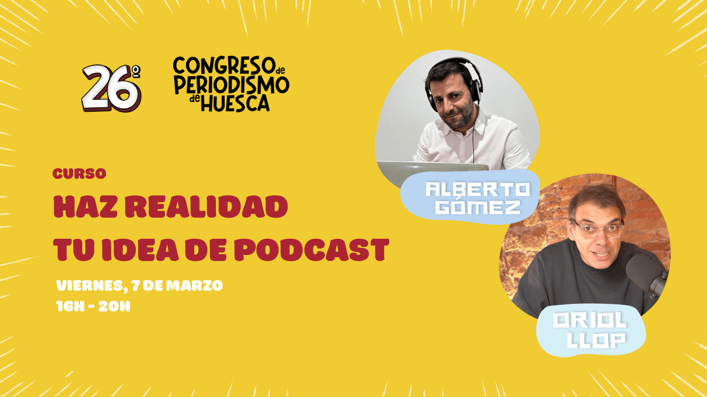 El 26º Congreso de Periodismo de Huesca organiza una nueva acción formativa: el curso “Haz realidad tu idea de podcast”. Se trata de un taller práctico en el que, de la mano de Alberto Gómez y Oriol Llop, los creadores de “Y esto, ¿cuándo sale?”, el podcast del Congreso de Periodismo de Huesca, los asistentes aprenderán el proceso de creación de un podcast desde la idea inicial hasta su publicación y difusión final. Esta formación está dirigida especialmente para aquellos de vosotros que ya tenéis una idea en la cabeza, para que salgáis de esa sesión de cuatro horas conociendo todas las herramientas para convertir en realidad vuestro proyecto de podcast.