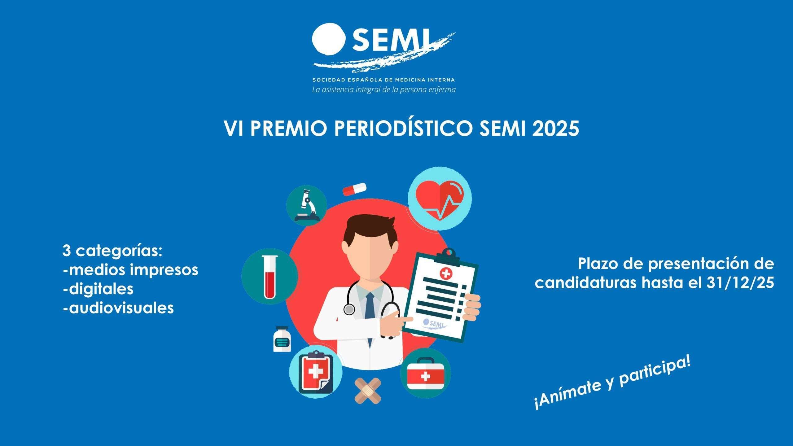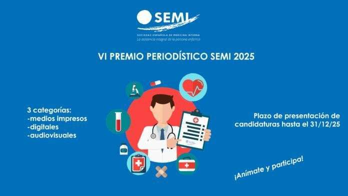 La Sociedad Española de Medicina Interna (SEMI) acaba de convocar el VI Premio Periodístico de Medicina Interna SEMI 2025, al que pueden concurrir trabajos periodísticos que traten y visibilicen de algún modo a la especialidad de Medicina Interna y sus profesionales, tanto desde el punto de vista médico-científico como desde el punto de vista social.