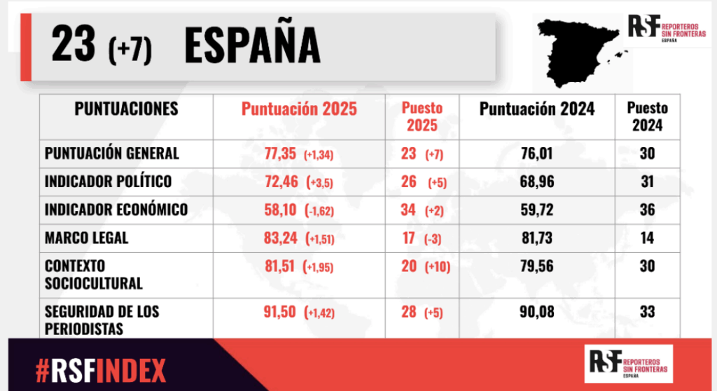 España ha escalado posiciones en la Clasificación Mundial de la Libertad de Prensa 2025 de Reporteros Sin Fronteras (RSF) y ha alcanzado el mejor resultado de su historia, al pasar del puesto 30º al 23º de los 180 países y territorios analizados y situarse entre el 15% de los países del mundo con mejores condiciones para el ejercicio del periodismo.