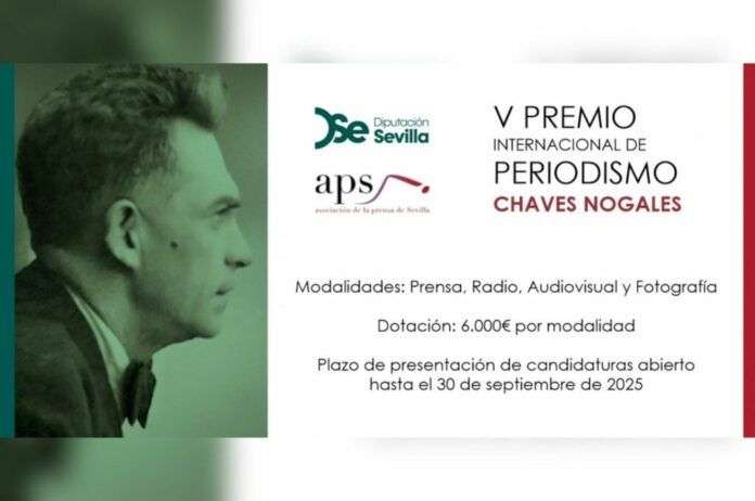 La Asociación de la Prensa de Sevilla junto con la Diputación de Sevilla, a través de su Área de Cultura y Ciudadanía, han convocado la quinta edición del Premio Internacional de Periodismo “Manuel Chaves Nogales”, correspondiente al año 2025, con el fin de poner en valor trabajos periodísticos en los que concurran valores profesionales y humanos de honestidad e independencia. El plazo concluye el martes 30 de septiembre.