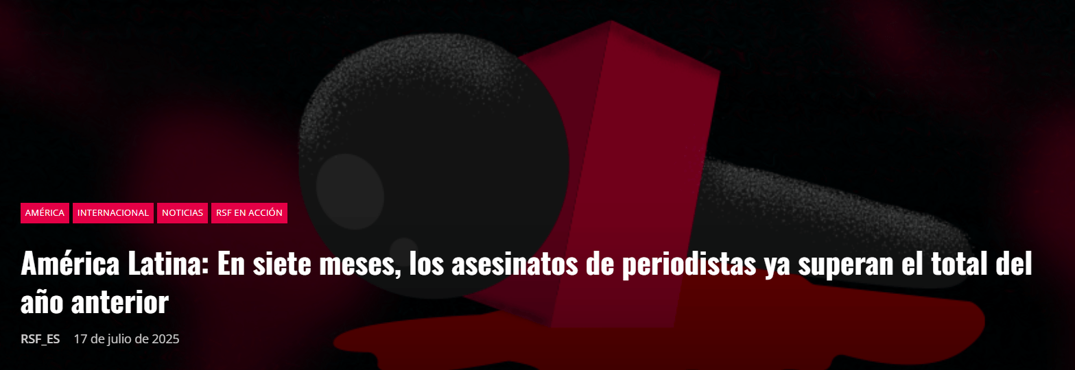 Desde enero, Reporteros Sin Fronteras (RSF) ha documentado el asesinato de al menos trece periodistas en América Latina. Esta cifra ya supera los nueve casos registrados durante todo el año 2024, lo que confirma un preocupante aumento de la violencia mortal contra la prensa.