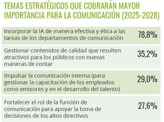 Casi el 80% de los profesionales de la comunicación considera que la integración ética y efectiva de la inteligencia artificial será el reto principal en los próximos tres años. Le siguen la producción de contenidos de calidad que logren captar la atención de las audiencias (35,2%) y el refuerzo de la comunicación interna (29%), que se utiliza para implicar a los empleados y fortalecer su papel como embajadores de la organización.