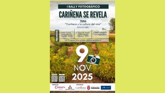El I Rally Fotográfico “Cariñena se revela” se celebra este domingo, 9 de noviembre y repartirá 550 euros en premios. Patrocinado por la Diputación de Zaragoza, es otros de los actos de la celebración de la localidad como Ciudad Europea del Vino 2025.