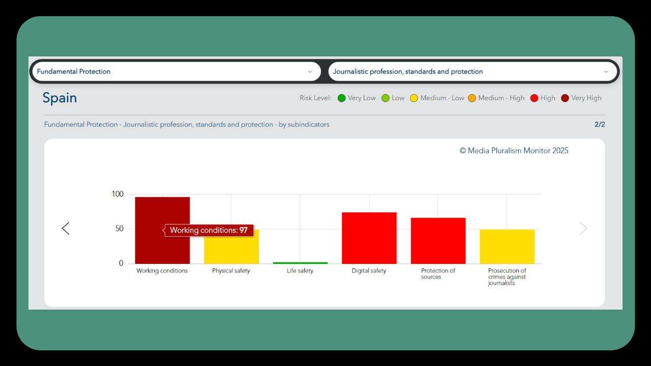 Desde hace unos diez años, un estudio europeo evalúa el pluralismo de los medios de comunicación en los países miembros de la UE y en los candidatos a la adhesión, en total 34. Equipos universitarios de cada país aplican la misma metodología para medir el pluralismo. Entre los criterios estudiados se encuentran las condiciones de protección de la profesión, en particular las condiciones de trabajo.