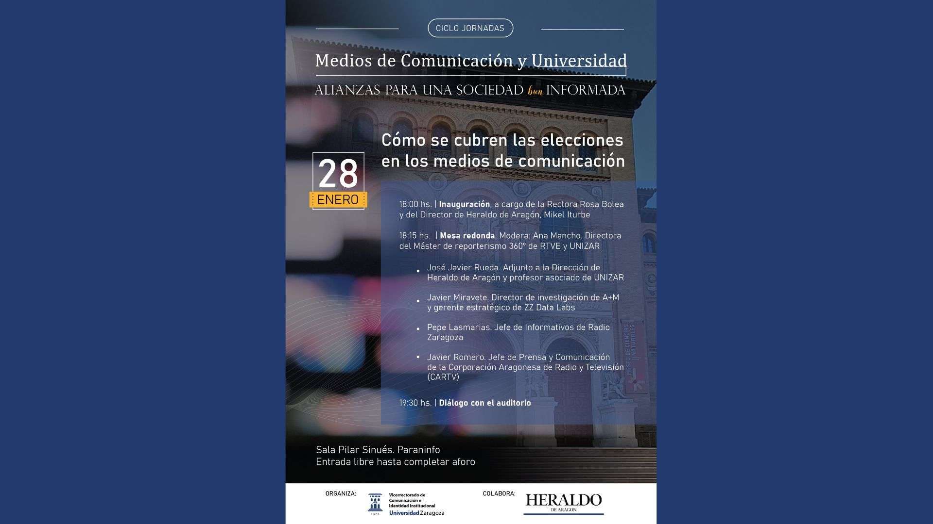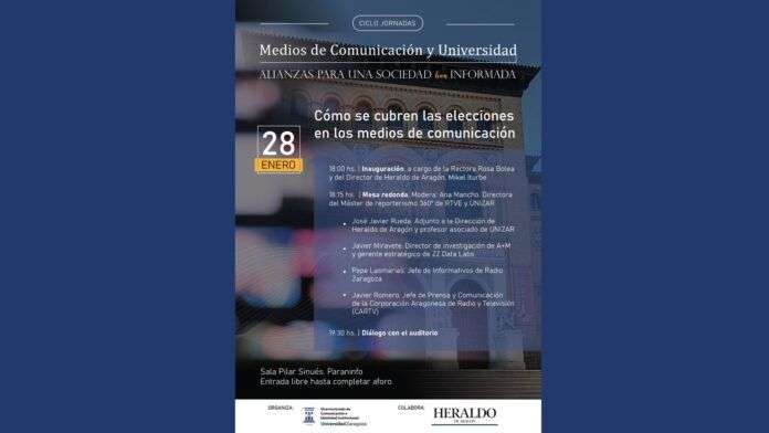 La primera sesión se celebrará el próximo miércoles 28 de enero. Colaborará Heraldo de Aragón y tendrá por título “Cómo se cubren las elecciones en los medios de comunicación”. Tras la inauguración, a cargo de la rectora de la Universidad de Zaragoza, Rosa Bolea, y el director de Heraldo de Aragón, Mikel Iturbe, comenzará la mesa redonda protagonizada por el adjunto a la dirección de Heraldo de Aragón y profesor asociado de la Universidad de Zaragoza, José Javier Rueda; el director de investigación de A+M y gerente estratégico de ZZ Data Labs, Javier Miravete; el redactor jefe de informativos de Radio Zaragoza, Pepe Lasmarías; y el jefe de Prensa y Comunicación de la Corporación Aragonesa de Radio y Televisión (CARTV), Javier Romero. Será moderada por la directora del Máster en Reporterismo 360o de Radio y Televisión Española (RTVE) y la Universidad de Zaragoza, Ana Mancho.