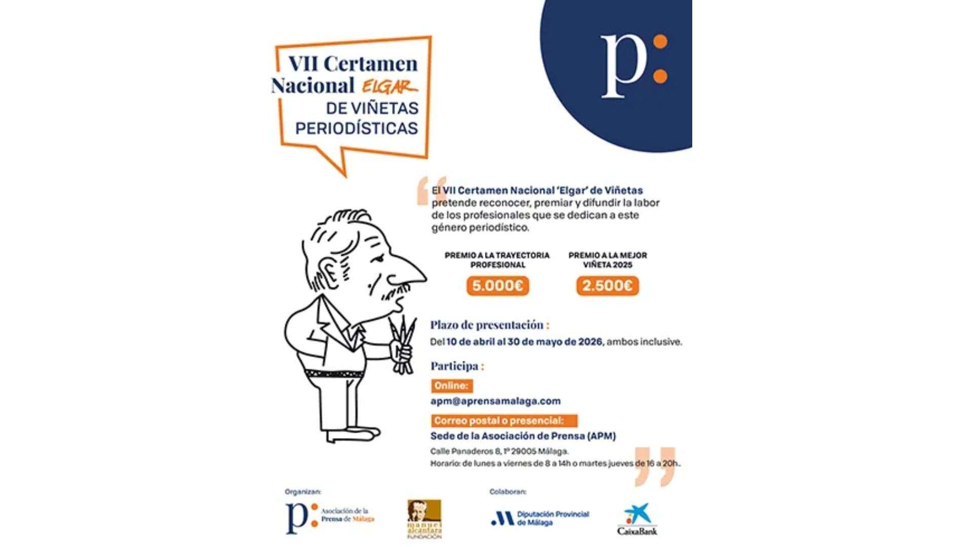 La Asociación de la Prensa de Málaga (APM) y la Fundación Manuel Alcántara convocan la VII edición del Certamen Nacional ‘Elgar’ de Viñetas Periodísticas, que cuenta con una dotación de 7.500 euros, de los que 5.000 euros corresponden al premio a la Trayectoria Profesional y 2.500 euros a la Mejor Viñeta Periodística de 2025.