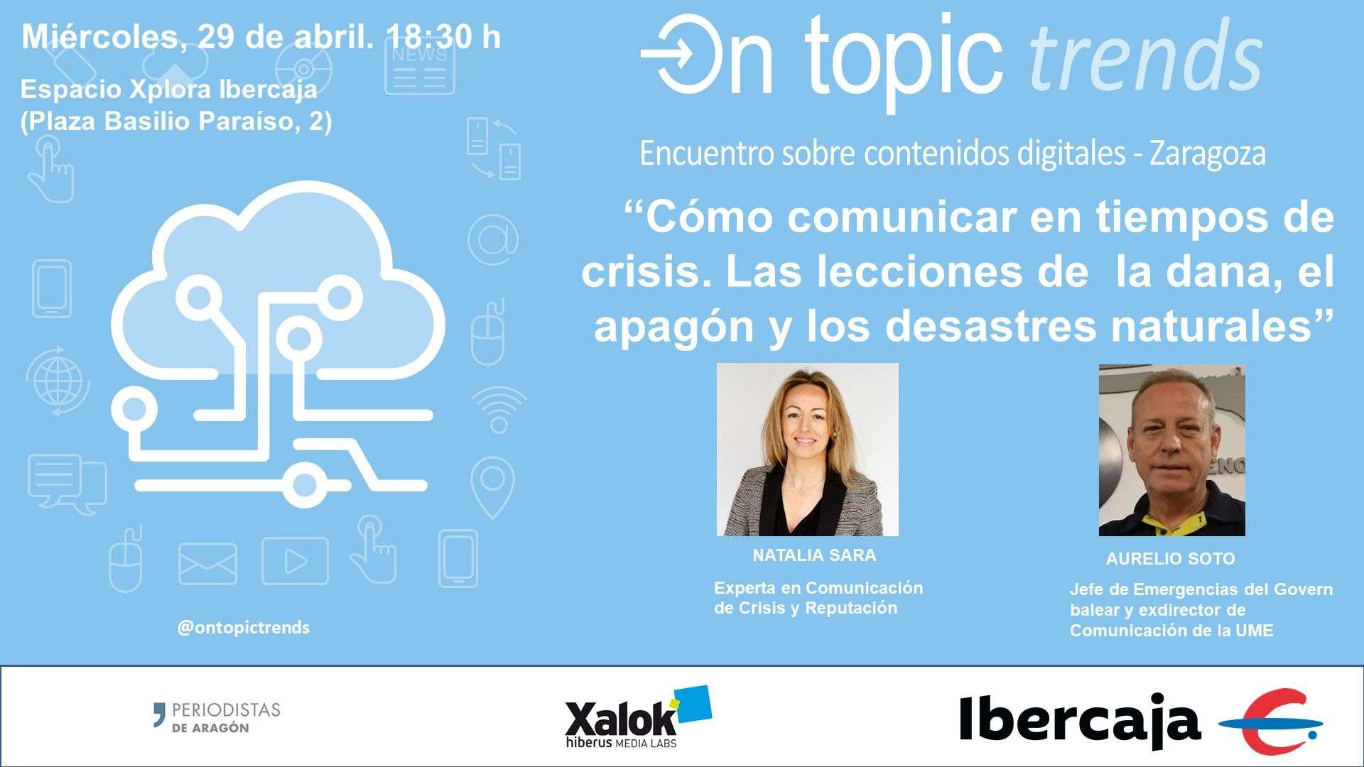 El Espacio Xplora Ibercaja acogerá el próximo miércoles 29 de abril una nueva edición del ciclo On Topic Trends, centrada en esta ocasión en la comunicación de crisis, con la participación de dos especialistas de referencia en este ámbito. El taller llevará el nombre ‘Cómo comunicar en tiempos de crisis. Las lecciones de la DANA, el apagón y los desastres naturales’.