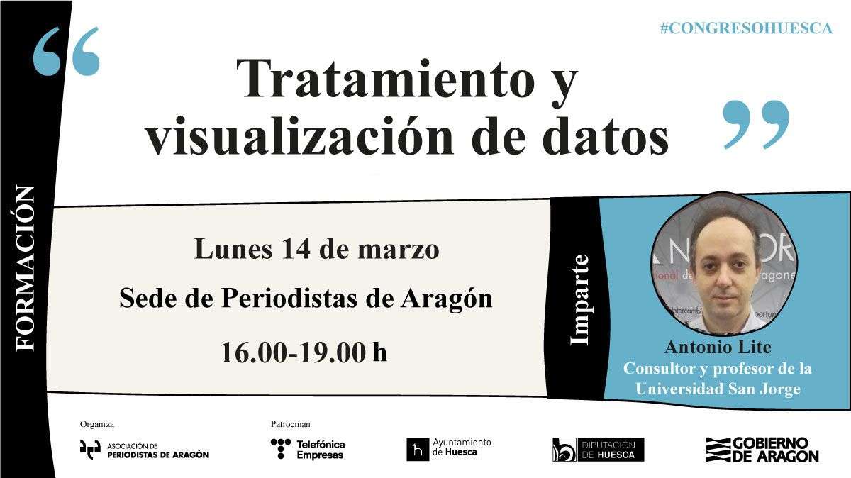 El consultor SEO y profesor de la Universidad San Jorge, Antonio Lite, imparte el taller de “Tratamiento y visualización de datos”, el lunes 14 de marzo, de 16.00 a 19.00 horas. La formación, que está abierta a los miembros de Periodistas de Aragón y a los inscritos en el Congreso de Periodismo de Huesca, podrá seguirse de manera presencial y online.